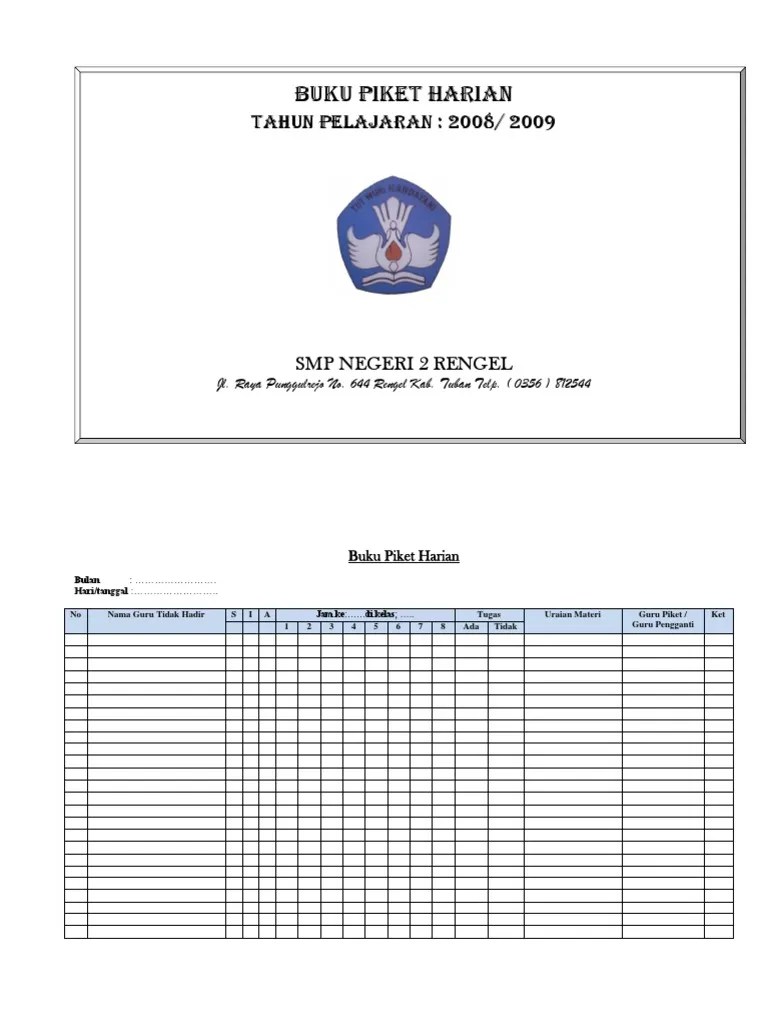 Contoh buku piket guru format lengkap. Sebagai evaluasi dan perbaikan kedepannya dalam berbagai hal. Download segera format buku piket guru ini pada link yang telah saya sediakan dibawah. Bagaimana cara penyempurnaan buku piket? Seperti judulnya buku piket sekolah maka buku ini diformat untuk memenuhi pencatatan kejadian penting terutama absen guru dan siswa. Jika dalam proses pendonloaddan buku piket guru smp/mts ini tidak sesuai atau terjadi masalah silahkan untuk menuliskan saran kritik ya pak/bu. Dengan adanya buku piket sekolah akan selalu mempunyai data terkait dengan keberadaan dan kodisi seluruh warga sekolah. More images for contoh buku piket guru » Di bawah ini adalah contoh alternatif format buku piket sekolah yang saya buat dan sempurnakan, memang masih sangat sederhana : Apa yang perlu digunakan untuk membuat buku piket guru? Menegur dan memberikan sanksi terhadap siswa yang melanggar tata tertib madrasah memberi surat izin pulang/tidak kepada siswa sebelum waktu keluar Ini sebagai salah satu administrasi yang haruslah dibuat petugas piket baik untuk mencatat kehadiran guru ataupun siswa. Aug 19, 2021 · kali ini kami bagikan contoh format buku piket guru yang mungkin bisa digunakan untuk melengkapi program kerja guru piket untuk laporan ke kepala sekolah.