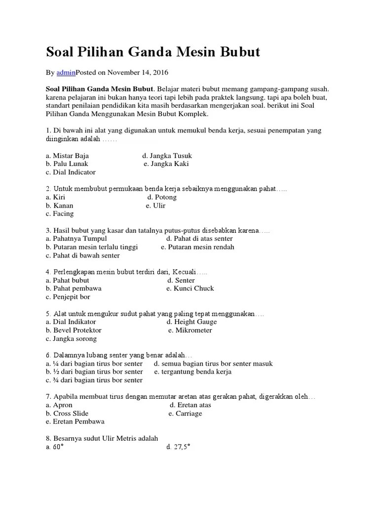 Berisi latihan dan pembahasan soal pilihan ganda dan essay ulanggan harian, ualangan tengah semeseter maupuan ujian akhir semeseter jurusan teknik mesin . Kaizenagung perhitungan di mesin bubut. Soal latihan prakarya untuk kelas 9 ini di buat lengkap dengan kunci jawabannya,. By guru vokasi in bank soal teori kejuruan, contoh soal essay mesin bubut dan jawabannya, contoh soal mesin bubut pilihan ganda beserta . Berdasarkan uraian di atas, yang paling tepat pengertian kerajinan bahan keras….
